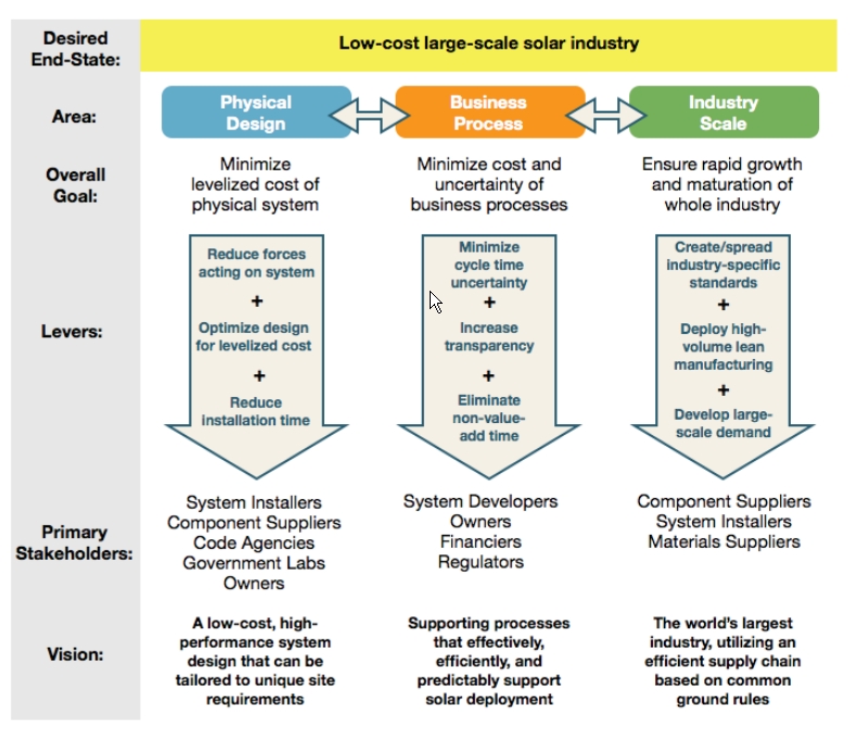 Dus is het interessant eens nader naar deze systeemkosten te kijken. De auteurs maken een nadere verbijzondering van de systeemkosten naar (ik vertaal ze maar even in mijn eigen woorden) kosten voorafgaand aan de productie (industriestandaarden), kosten tijdens het productieproces en kosten ná de productie die vooral zijn gelegen in de concrete toepassing van de zonnepanelen. Dus vóór, tijdens en na, zie ook het bijgaande overzicht. Denk bij de kosten vóór aan modulaire standaarden die makkelijk uitwisselbaar zijn, aan verdere R&D die voor optimale maatvoering zorgen (verkleining, geen last van wind etc). Kosten tijdens worden in de fabriek bepaald en zijn eigenlijk de standaard ‘business process redesign’ (BPR) stappen. Zorg voor korte productielijnen, voorkomen onnodige uitval etc. De kosten ná worden bepaald door het gemak van installatie van de spullen op de specifieke locatie van de eindgebruiker. Denk hier aan goede opleidingen voor installateurs, het beschikbaar zijn van standaard bedradings-units, van standaard omschakelkastjes etc.